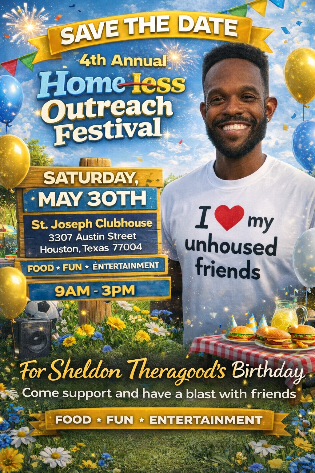 Join us for a powerful day of compassion, connection, and community as we celebrate the 4th Annual Homeless Outreach Festival in honor of Sheldon Theragood’s birthday.